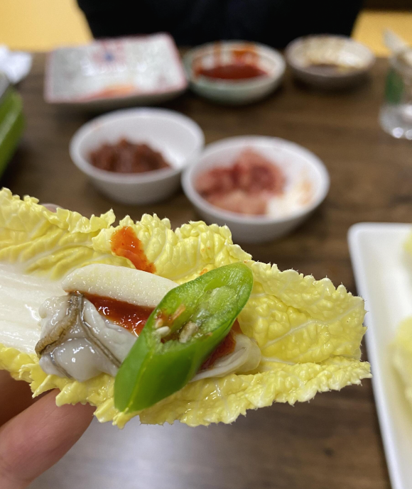 배추에 굴올려서 초장 마늘 고추랑 먹으니 맛있더라구요