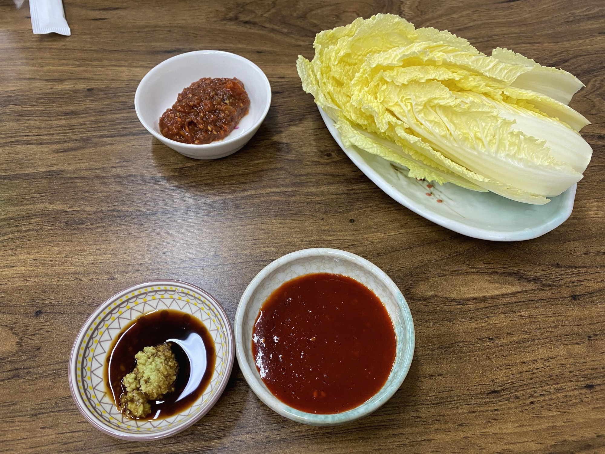 일단 들어가자마자 초장,간장,생와사비,배추 주셨어요